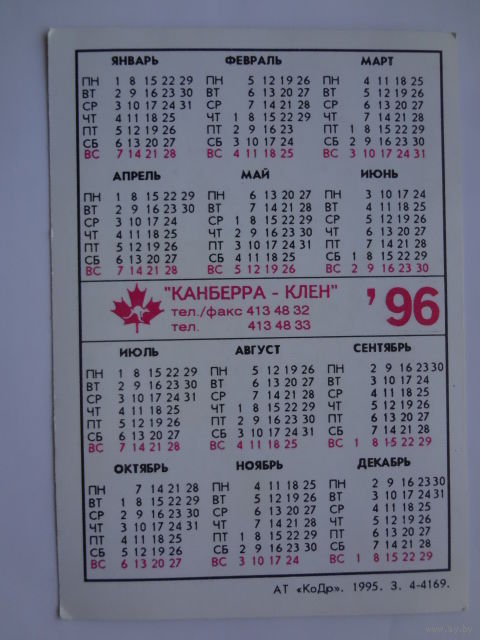 Календарик 1996 г. Сбарро-Гелиос (Швейцария) - прототип.