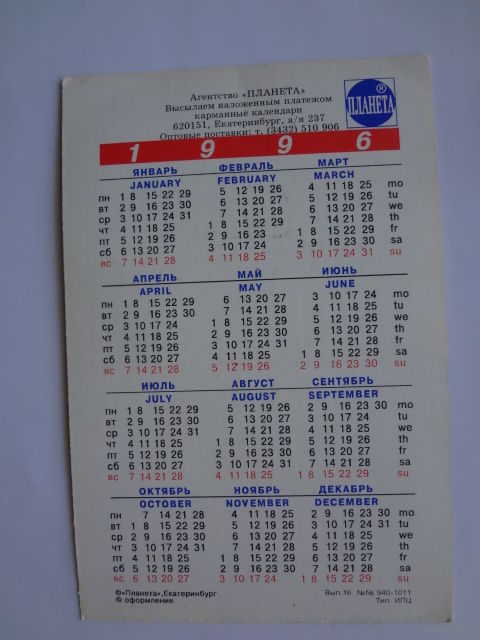 Календарик 1996 г. Такса.