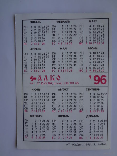 Календарик 1996 г. Тех-арт-Каррера 3,8 (ФРГ).