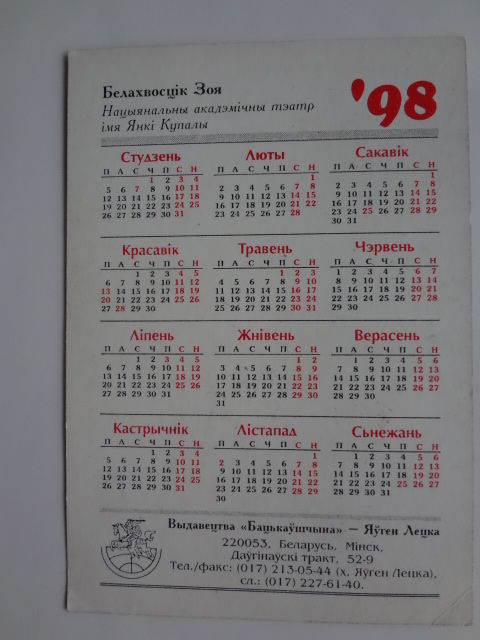 Календарик 1998 г. Актрысы беларускіх тэатраў. Белахвосцік Зоя.