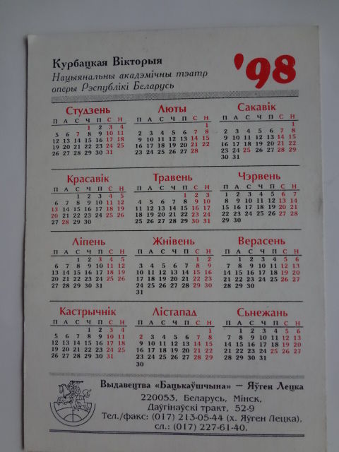 Календарик 1998 г. Актрысы беларускіх тэатраў. Курбацкая Вікторыя.