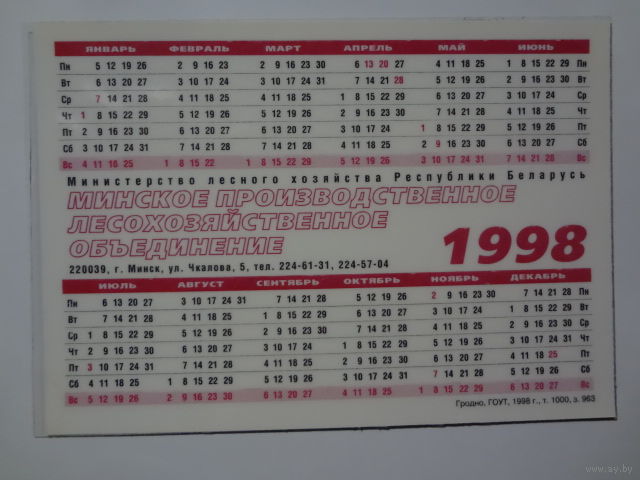 Календарик 1998 г. Берегите лес - самый ценный дар природы!