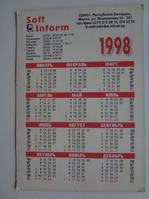 Календарик 1998 г. Корпорация СофтИнформ. Программные продукты мирового уровня.