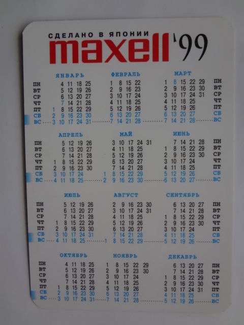 Календарик 1999 г. Сделано в Японии. Maxell.