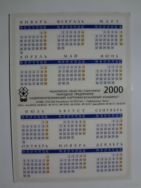 Календарик 2000 г. АО работников НП Набережночелночный КБК.
