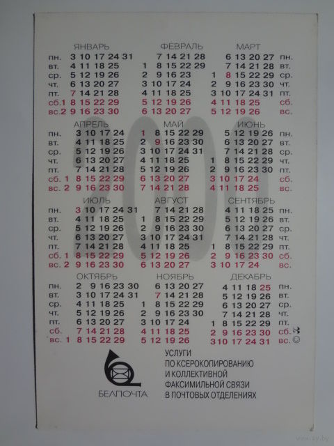 Календарик 2000 г. Белпочта. Услуги по ксерокопированию и коллективной факсимильной связи.