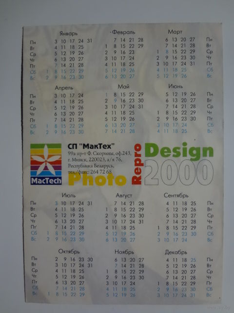 Календарик 2000 г. Реклама не ждет - звоните.