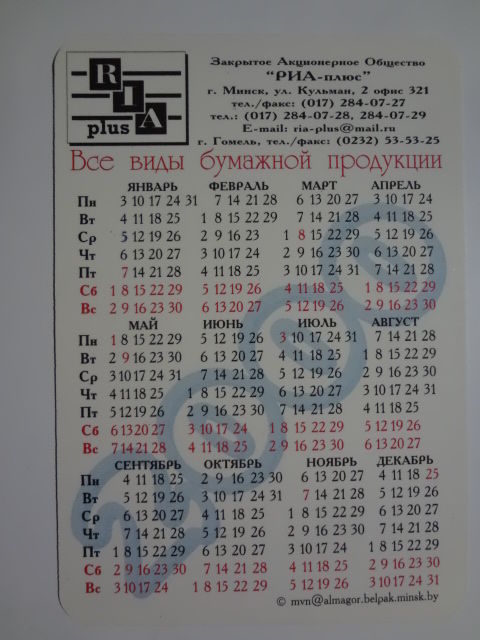Календарик 2000 г. ЗАО РИА-плюс. Ваш поставщик бумаги.