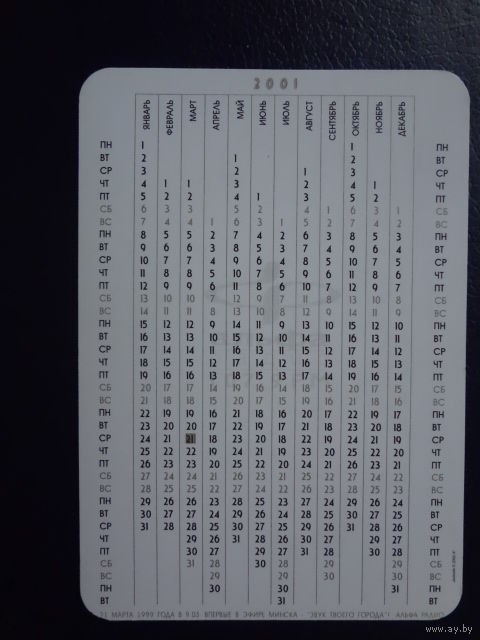 Календарик 2001 г. Альфа радио 107,9 FM. Вадим Галыгин.