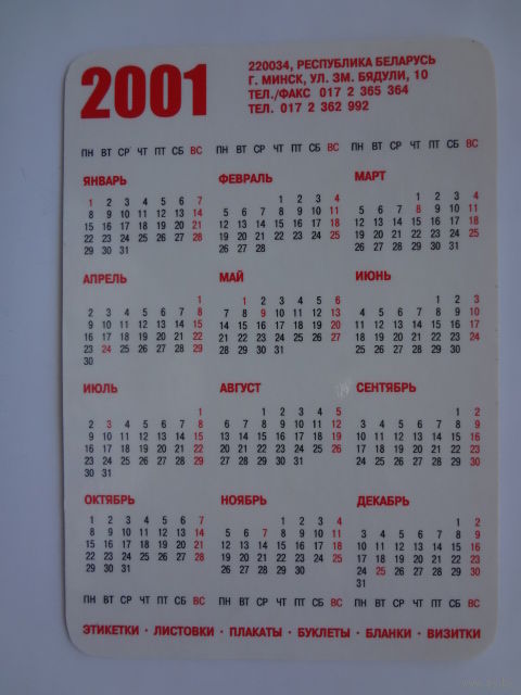 Календарик 2001 г. Бонем. Полиграфическо-издательское предприятие.