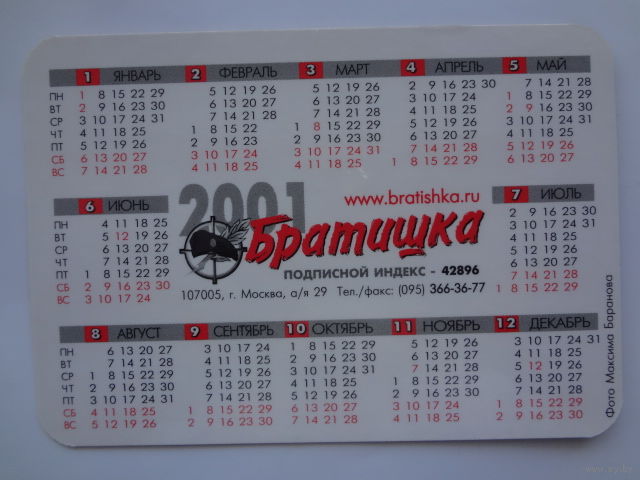 Календарик 2001 г. Братишка.