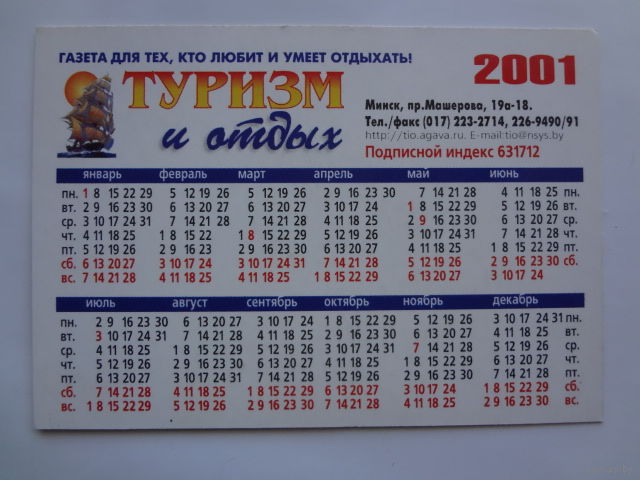 Календарик 2001 г. Газета Туризм и отдых. Прорвемся!