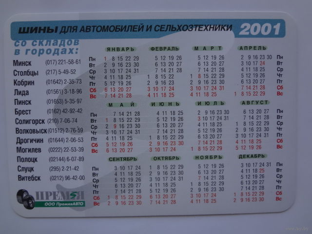 Календарик 2001 г. Шины для автомобилей и сельхозтехники.