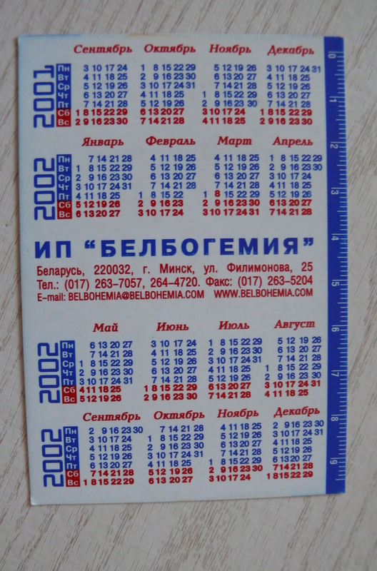 Календарик, 2002, Белбогемия; изд. Минск.