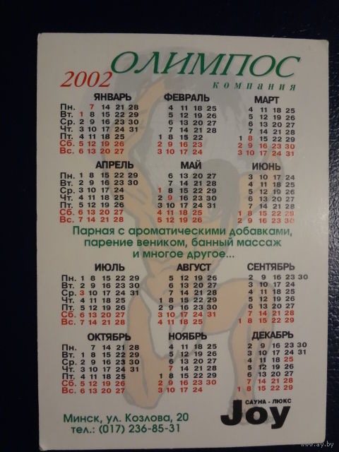 Календарик 2002 г. Олимпос. Парение веником, банный массаж.