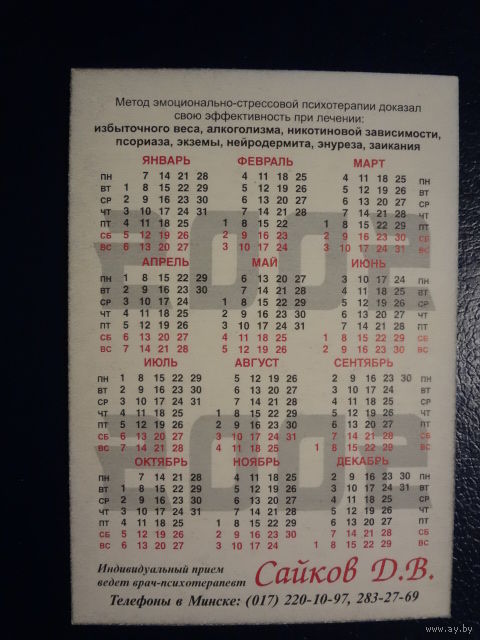 Календарик 2002 г. Врач-психотерапевт Сайков Д.В.