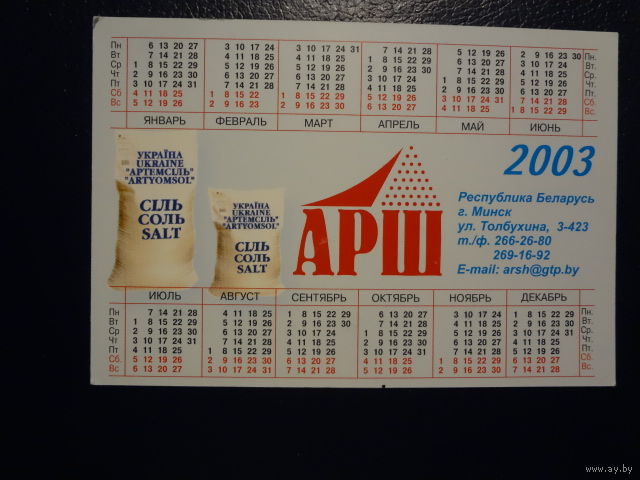 Календарик 2003 г. АРШ. Соль пищевая производства Украины.