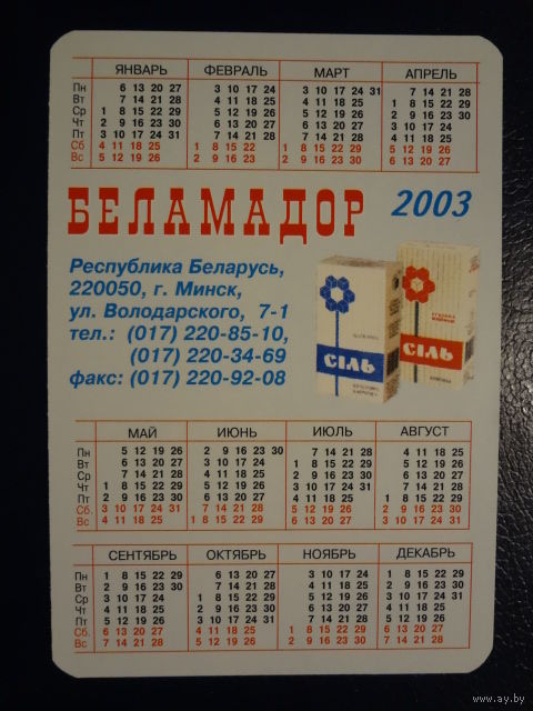 Календарик 2003 г. Беламадор. Соль пищевая производства Украины.