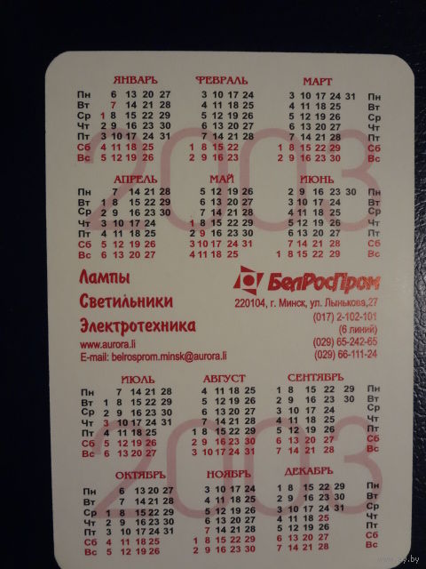 Календарик 2003 г. БелРосПром. Любые лампы.