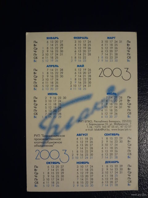 Календарик 2003 г. Блакіт. (Баранавичи).