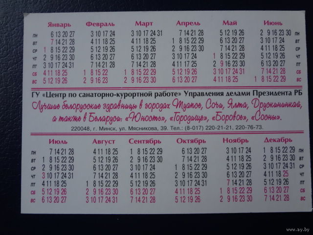 Календарик 2003 г. Центр по саниторно-курортной работе Управления делами Президента РБ.