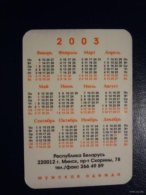 Календарик 2003 г. Элиз. Фирменный магазин. (Минск).