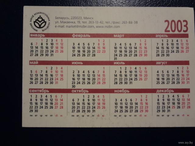 Календарик 2003 г. Минский завод безалкогольных напитков. Вкус спелых фруктов.