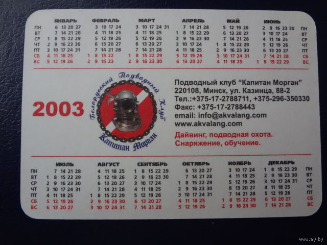 Календарик 2003 г. Подводный клуб Капитан Морган.