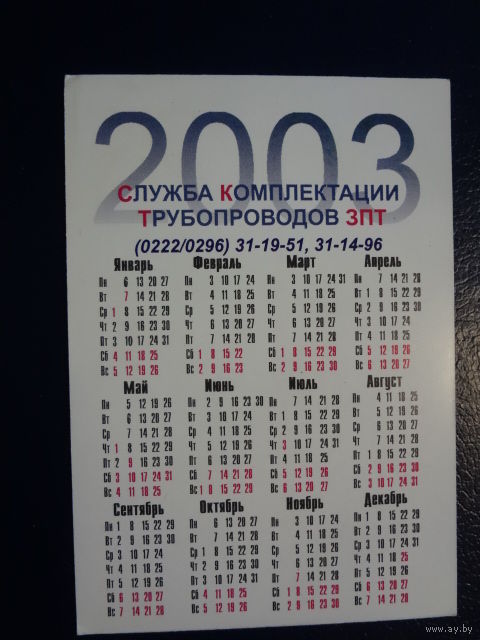Календарик 2003 г. Служба комплектации трубопроводов ЗПТ.