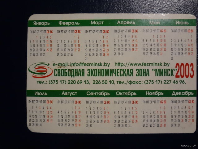 Календарик 2003 г. Свободная экономическая зона Минск.