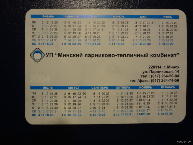 Календарик 2004 г. Минский парниково-тепличный комбинат.