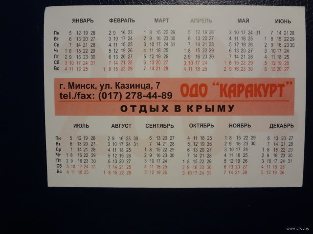 Календарик 2004 г. ОДО Каракурт. Отдых в Крыму.