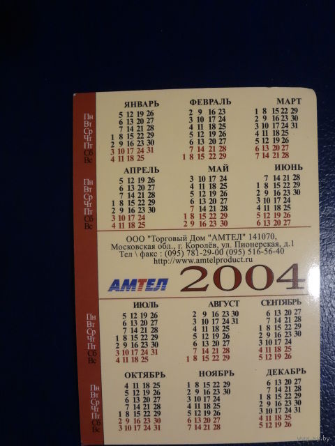 Календарик 2004 г. Пейте на здоровье чай АМТЕЛ.