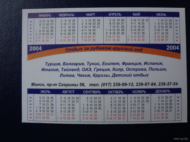 Календарик 2004 г. Риола. Тур. агентство. Пальма.
