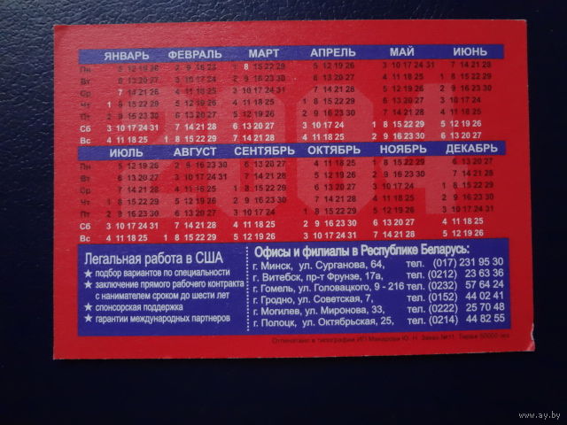 Календарик 2004 г. Sakub. 100% легальная работа в США.