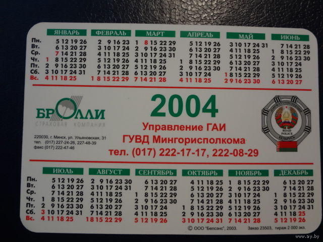 Календарик 2004 г. Управление ГАИ. Страховая компания БРОЛЛИ.