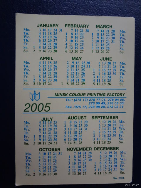 Календарик 2005 г. Фабрика цветной печати. г. Минск.