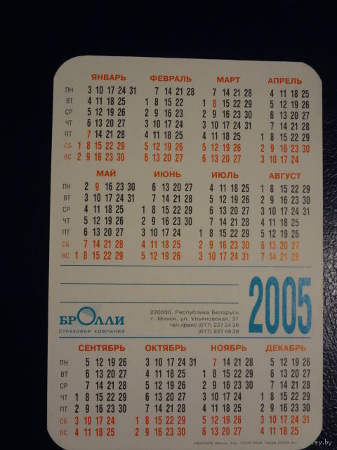Календарик 2005 г. Лоев. Страховая компания БРОЛЛИ.