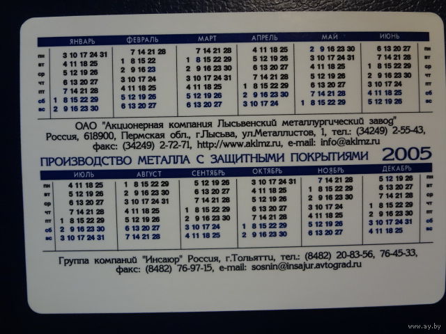 Календарик 2005 г. Производство металла с защитными покрытиями.