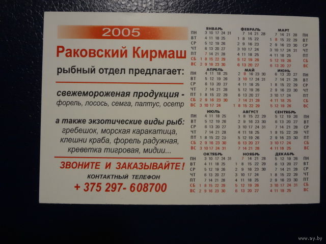Календарик 2005 г. Раковский Кирмаш. Рыбный отдел.