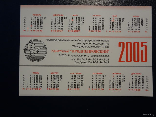 Календарик 2005 г. Санаторий Приднепровский (Рогачевский р-он).