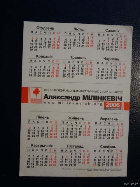 Календарик 2006 г. Аляксандр Мілінкевіч.