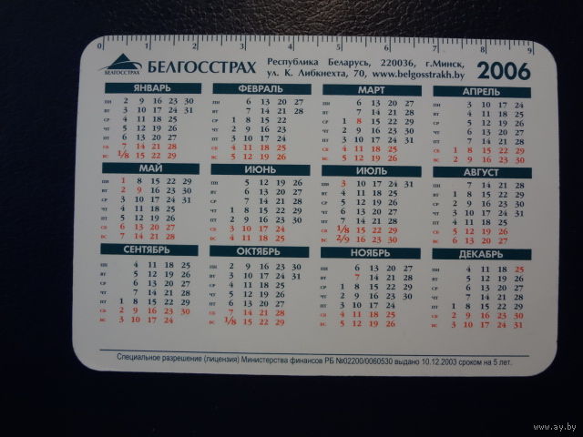 Календарик 2006 г. Белгосстрах. Страхование от несчастных случаев.