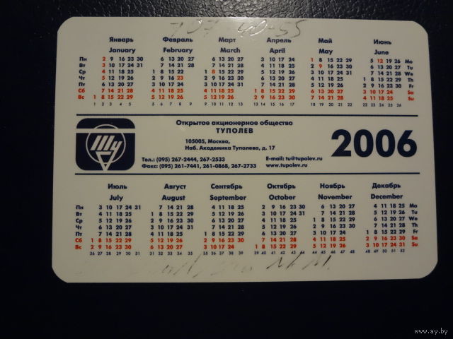 Календарик 2006 г. ОАО Туполев.