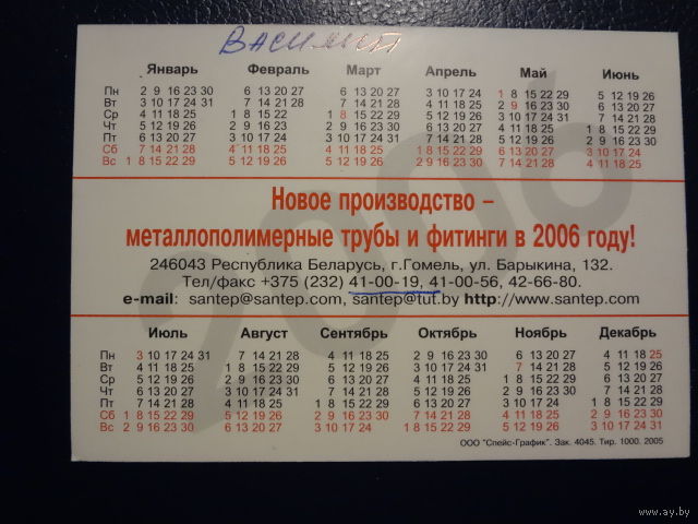 Календарик 2006 г. Сантэп (Гомель).