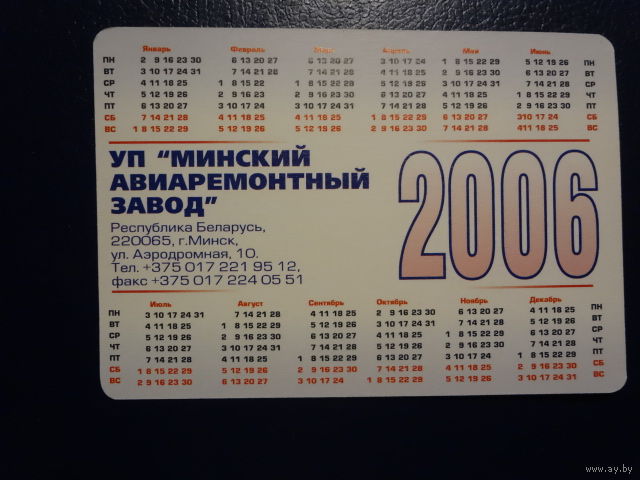 Календарик 2006 г. УП Минский авиаремонтный завод.