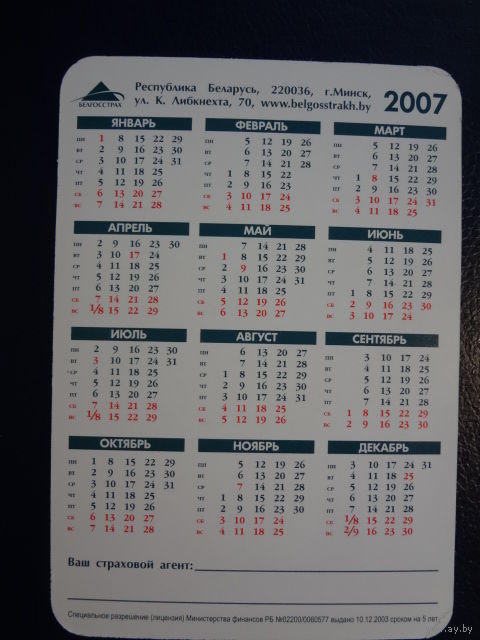 Календарик 2007 г. Белгосстрах. Страхование от несчастных случаев.