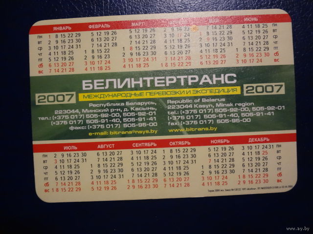 Календарик 2007 г. Белинтертранс.
