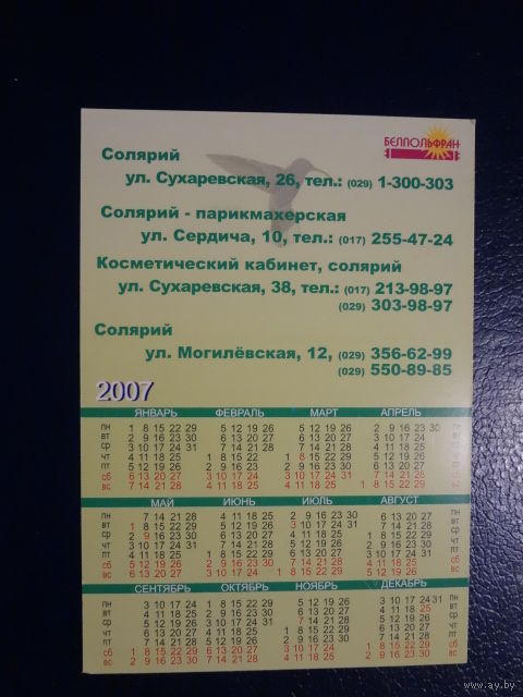 Календарик 2007 г. Белпольфран. Солярий.