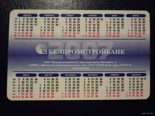 Календарик 2007 г. Белпромстройбанк. Депозиты...